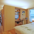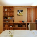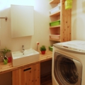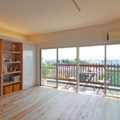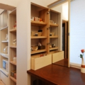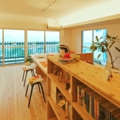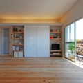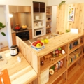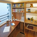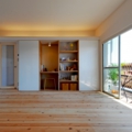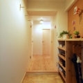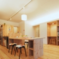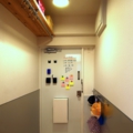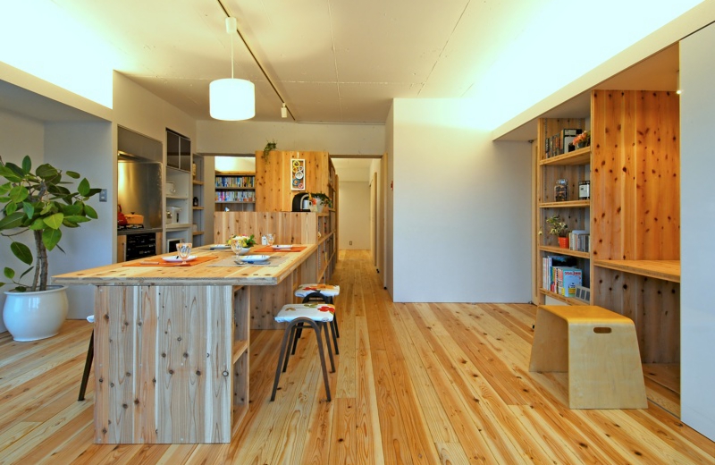 もと2軒の住戸の壁を扉一枚だけで繋いでいたため、片方の玄関は使われていなかった。そこで玄関を入れ替えて、元の玄関を勝手口に利用することで、戸建て感覚の住まいにリフォームした。幼い子供達にも安全で限られた予算内で実現するため、安価な杉材を多用し、建て主にも工事に参加してもらった。