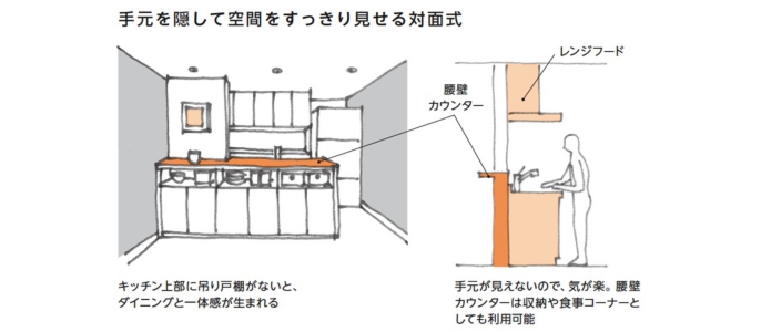- そこで私が良く提案しているのは、造作カウンター付きのI型キッチンです。I型キッチンはシンクとコンロが一列に並んだキッチンで、通常、壁に向かって設置されるのですが、大工さんに、ダイニングとの間に腰壁カウンターを造ってもらい、これに向かってキッチン本体を取り付けます。腰壁カウンターの高さを1・1m程度にするとキッチンの手元を隠すことができる上に、カウンター下を食器棚などの収納に利用したり、高めのスツールを置いて簡単な食事コーナーにも利用できます。