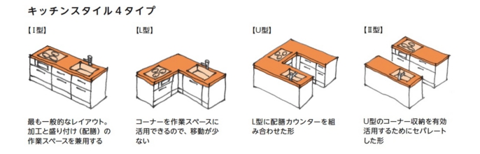 - I型やL型など、どのレイアウトが使いやすいかは、使う人の慣れや好みによることが多いですが、むしろ動線やダイニングとの関係を考慮して、プランに応じて考えたほうが良いでしょう。ただひとつ気を付けないといけないのは、料理の手順に沿ったレイアウトが重要だということ。保存、洗浄、加工、調理、盛り付けの順に機器類が配置されていることが使いやすさの基本です。