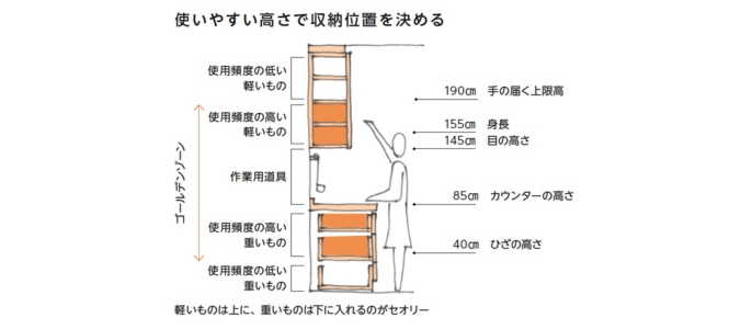 - また、立ったまま手の届く高さは最も使いやすいエリアなので、使用頻度の高いものを収納するのに適しています。手の届かないところは使用頻度の低いものの収納に充てることで、スペースを効率良く生かせます。吊り戸棚をできるだけ低く取り付けて機動的な収納スペースを増やすことで、コンパクトで使いやすいキッチンが生まれます。