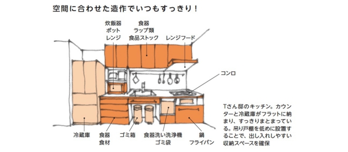- 既製のシステムキッチンで思い通りの組み合わせができない時には、Tさんのように思い切ってキッチンのオーダーメードを考えてみるとよいでしょう。空間に合わせて必要なものが必要な場所に収まるよう工夫することで、コンパクトでありながらも、機能的なキッチンにすることができます。