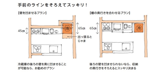 - 対面式のキッチンレイアウトで一番頭を悩ませるのは冷蔵庫の置き場所です。一般的な冷蔵庫の奥行きはキッチン本体と同じ65㎝程度なのでキッチンの横に並べるとスッキリ納めることができますが、食器棚と一緒に並べる場合は、一般的な食器棚の奥行きが45㎝程度のため、冷蔵庫だけが出っ張ってしまうことに。以前は薄型の冷蔵庫も販売されていましたが、需要が少なかったせいか、残念ながらいつの間にか消え去ってしまいました。